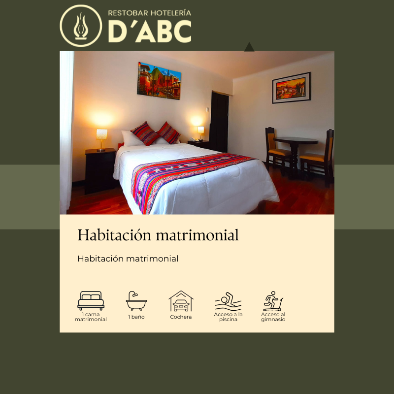 Descubre la magia de una escapada romántica en nuestros cuartos matrimoniales de D'ABC, el lugar ideal para parejas que buscan comodidad, privacidad y momentos inolvidables. Disfruta de habitaciones amplias y modernas, diseñadas para crear experiencias únicas. Cada cuarto matrimonial está equipado con todo lo necesario para garantizar tu descanso: cama queen size, baño privado, Wi-Fi gratuito y una atmósfera acogedora pensada para disfrutar juntos.